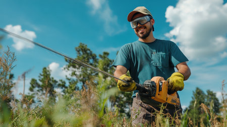 A worker wearing safety goggles and gloves smiles while using a trimmer in an outdoor setting. This image captures the essence of professional gardening and maintenance activities.