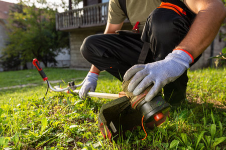 Man checking grass trimmer before star working in his garden maintenance.