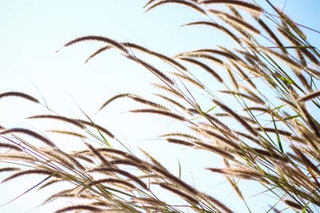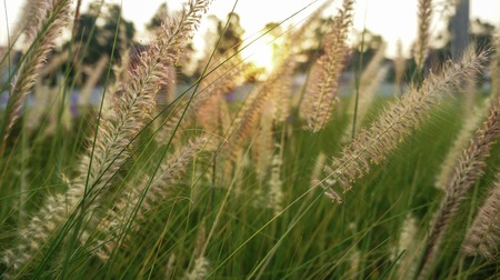 Sunlight on Grass flower flowing in hard wind in an outdoor open field.