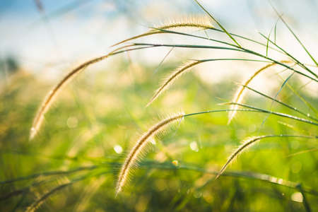 Close-up of grass flower in a meadow sparkle by the rising sun. Backlit sun