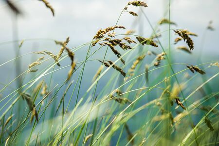 Meadow field with fluffy grass. Summer spring natural landscape. Green landscape background for a postcard, banner or poster. Close-up macro photography, selective focusing.