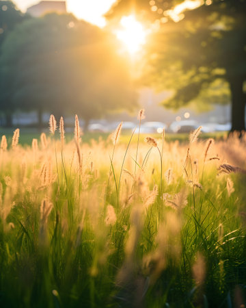 This image features tall grasses swaying gently in the breeze, bathed in soft sunlight during sunset, creating a tranquil atmosphere perfect for nature lovers.