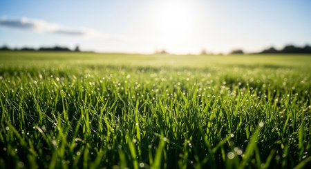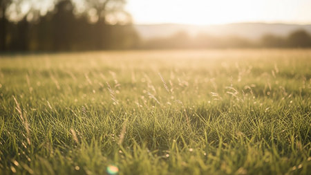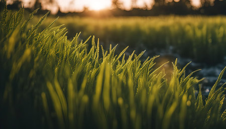 A close-up view of vibrant green grass under the warm glow of a sunset, showcasing nature's beauty and tranquility, perfect for relaxation and outdoor scenes.