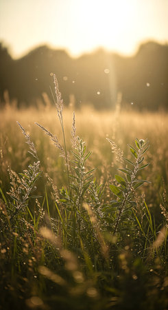 A serene meadow scene bathed in golden hour light. Tall grasses and plants are illuminated by the sun, creating a warm, inviting atmosphere. Bokeh effect adds depth and a dreamy quality.