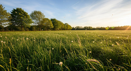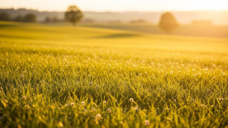Lush green meadow field at golden hour with gentle sunlight and calm mood