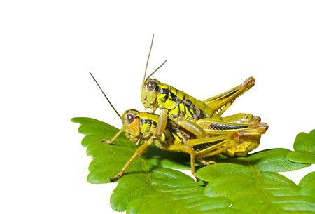 A close up of the two grasshoppers on leaf. Isolated on white.