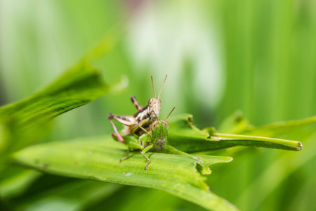 Close up of the Grasshoppers standing on green leaves at the background. Selective focus of the Caelifera on green leaf.