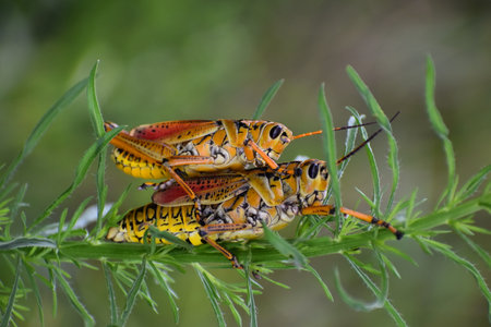 Two eastern lubber on leaves at Nature Coast Botanical Garden in Spring Hill, Florida.