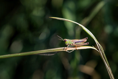 Macro photo of Meadow grasshopper (Pseudochorthippus parallelus) sitting on a blade of grass. Horizontally.