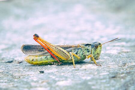 Macro close up of a colorful Mexican grasshopper details, selective focus