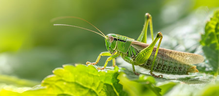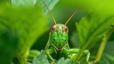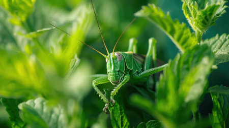 This captivating close-up image features a vibrant green grasshopper resting on lush green leaves, showcasing the beauty of nature. The intricate details highlight the insect's features against a backdrop of rich foliage, creating a serene outdoor scene.