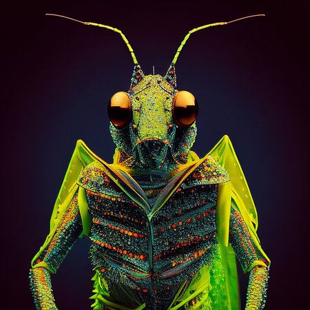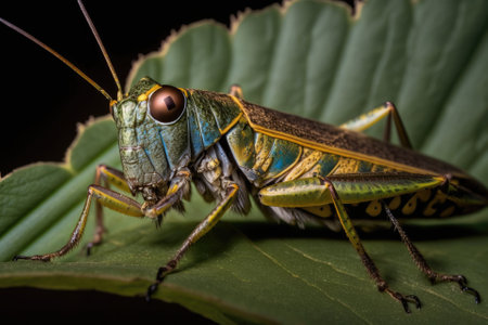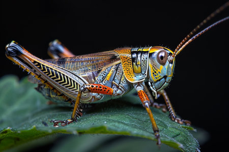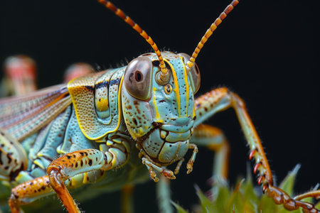 This detailed macro photograph captures a grasshopper showcasing its vibrant colors and intricate features set against a dark background, perfect for nature enthusiasts.