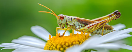 Grasshopper resting on daisy in a garden, close-up nature shot