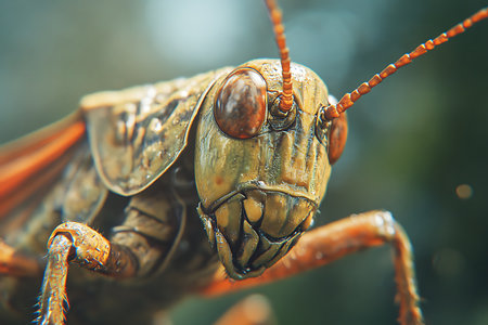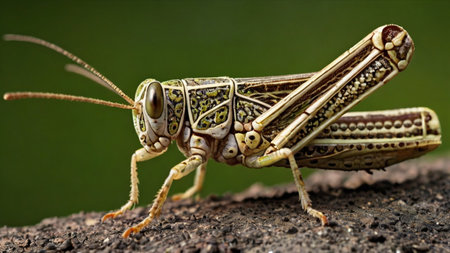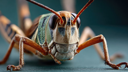 This stunning close-up photograph of a grasshopper reveals intricate details and textures of its body, showcasing the beauty of the insect world.