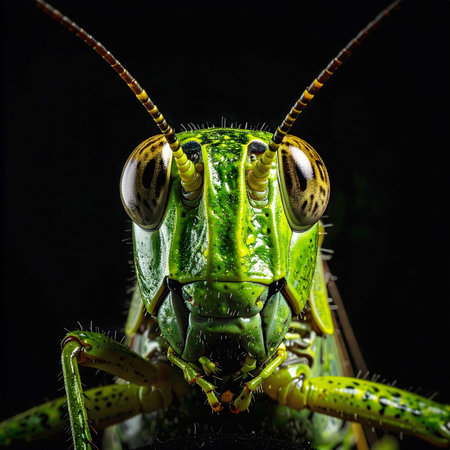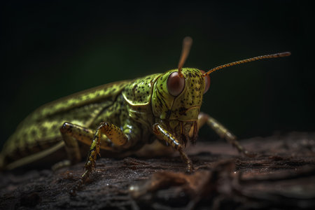 Detailed macro shot of Locust or grasshopper on black background. Insect s body is vibrant green color. Image showcases intricate details of the Locust s body, highlighting its impressive size.