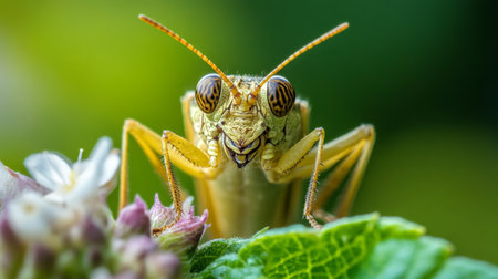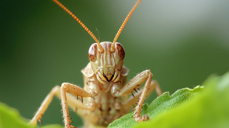 Green locust sitting on leaf, macro focus on animal antenna generated by artificial intelligence