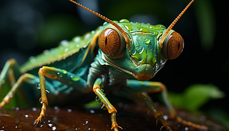 A detailed macro view of a green grasshopper, highlighting its patterned compound eyes, antennae, and vibrant body under dramatic lighting