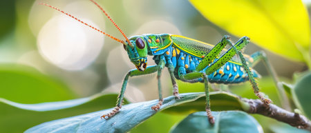 A vibrant grasshopper with striking colors is perched on a leaf showcasing intricate patterns and a detailed texture under natural light.