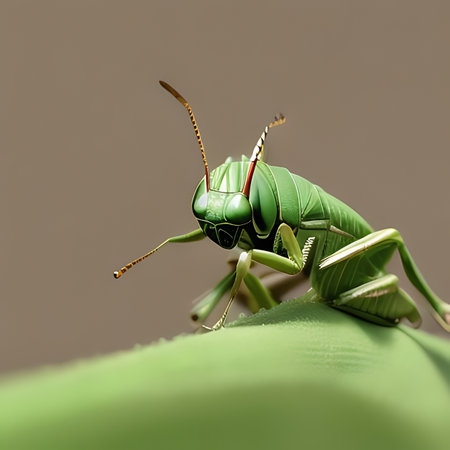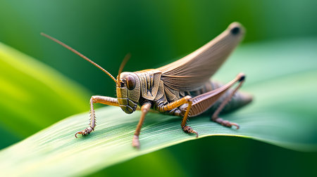 A detailed macro shot of a grasshopper perched on a vibrant green leaf, showcasing its intricate features.