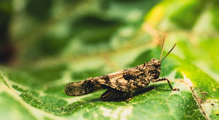 A detailed closeup captures a grasshopper resting on a vibrant green leaf. The shallow depth of field emphasizes the insects intricate textures and colors.