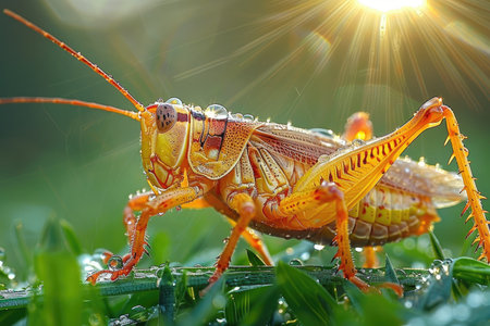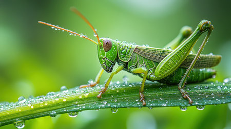 A stunning macro photograph showcasing a vibrant green grasshopper perched on a dew-covered blade of grass, illuminated by soft morning light.