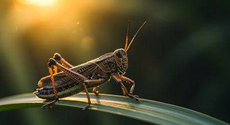 A stunning close-up shot of a vibrant grasshopper resting on a green stem, highlighting intricate details against a soft, blurred natural background during golden hour.