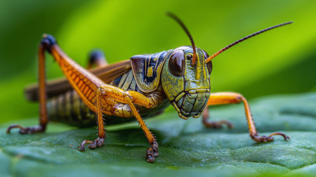 A stunning close-up of a colorful grasshopper resting on a green leaf, showcasing intricate details and vibrant colors in its natural habitat.