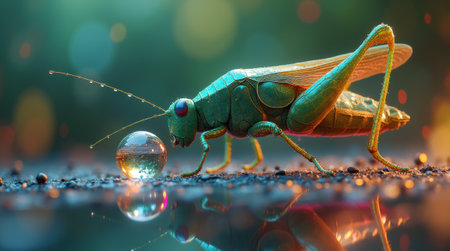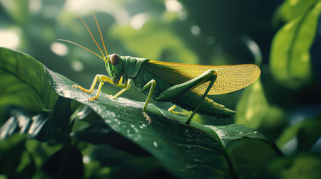 a green grasshopper perches on a leaf during the evening, showcasing a futuristic realism style. the image features lens flares, realistic animal portraits, and shiny eyes. the soggy leaf adds a touch of miniaturecore aesthetic to the photo, while the use of photo-realistic techniques enhances its overall appeal. ai generated