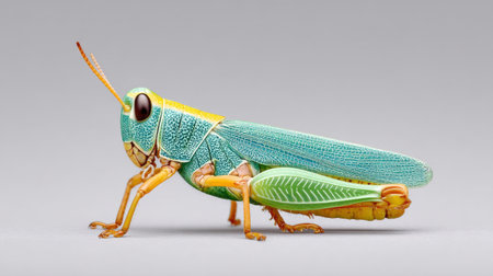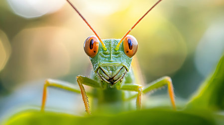 Stunning close-up of a green grasshopper showcasing its detailed structure and vibrant coloration. Perfect for nature enthusiasts and educational purposes, highlighting insect beauty.
