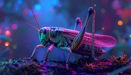 A grasshopper against a nature background with neon colors in a cyberpunk style.