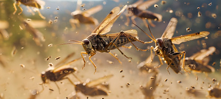 Multiple flies in flight, moving swiftly and erratically. invasion of locusts
