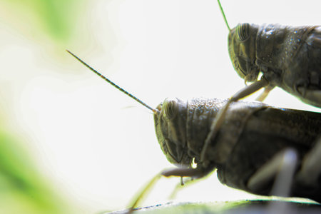 Close-up of two brown grasshoppers on a stem. Showcasing interaction and natural colors, Wulai, New Taipei City.