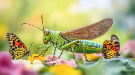 A captivating scene of a green grasshopper and vibrant butterflies on flowers, showcasing the beauty of nature and the delicate balance in a colorful garden setting.