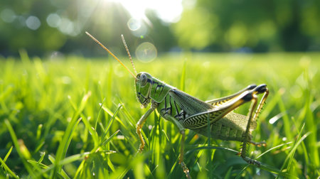 A stunning close-up image of a grasshopper on a blade of grass, revealing intricate textures and vivid colors, capturing the beauty of wildlife in a serene natural setting.