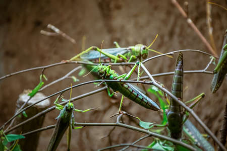 green giant grasshoppers on branches in a terrarium