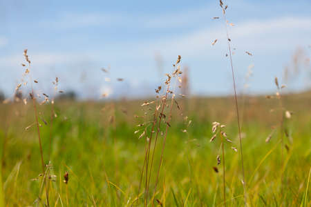 Tall field grass on a spring morning. Gentle sunbeams. Beautiful background or texture. Soft selective focus. Natural composition with copy space.