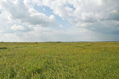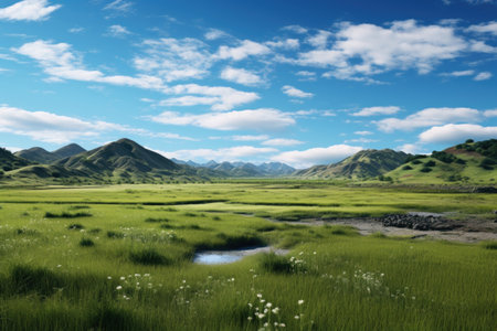 Vast steppe grassland with endless horizon under a clear blue sky and scattered clouds