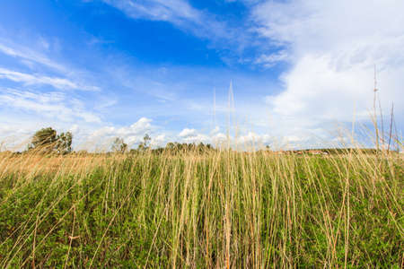 Green showing vast green grassy field with patches of tall golden grass and long shadows in warm sunlight. resolution use.
