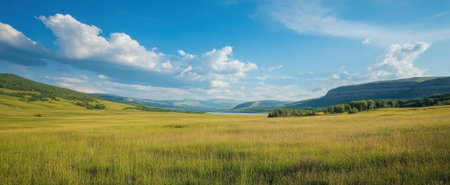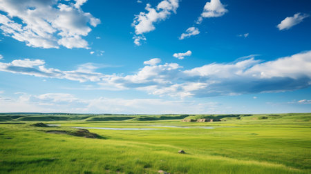 A stunning panoramic view of a lush green field under a bright blue sky with fluffy white clouds. This landscape embodies tranquility and natural beauty, perfect for relaxation and exploration.