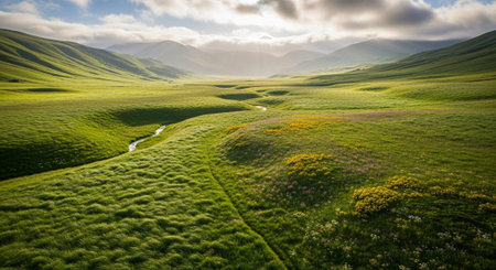 Golden hour sunlight bathes a vast field of tall green grass and scattered wildflowers, creating a hazy, serene...
