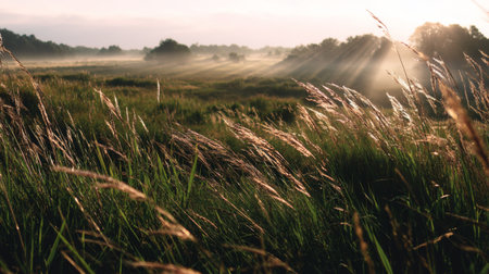 A breathtaking view of a misty field at sunrise, where light rays filter through tall grass, creating a tranquil atmosphere. Perfect for nature lovers.
