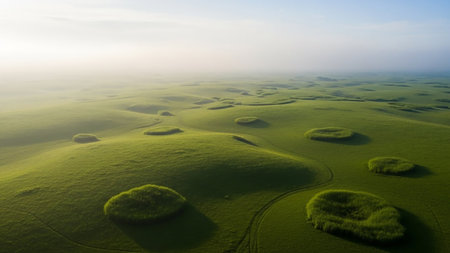 Parks/ showing aerial view of a lush green meadow with numerous oval-shaped grassy mounds creating a unique patterned landscape keywords: green meadow, grassy...