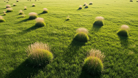 A lush green meadow is dotted with numerous round clumps of spiky grass. Bright sunlight creates soft shadows across the textured ground.