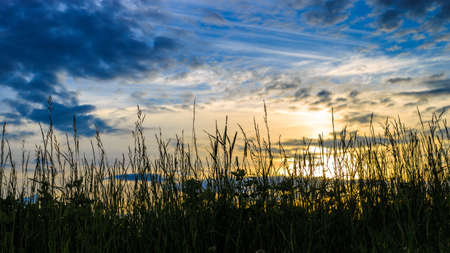sunset on the field view through the grass dry on the horizon the sky and a small cloud stretched across the sky