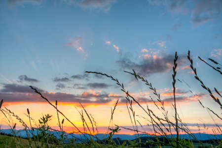 Colored sky with grass silhouette along bottom
