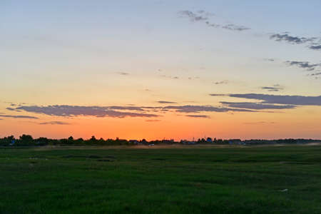 Evening twilight over the meadow. Bright dramatic sky and green grass. Rural landscape under a picturesque colorful sky at sunset.