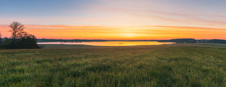 Panoramic view to meadow and pond under dramatic sunrise sky. Czech spring landscape
