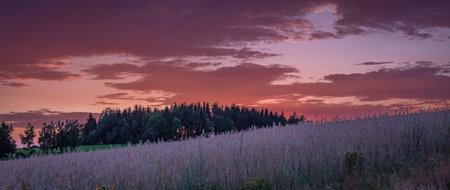 Sunset on summer hot dry grain field in Krkonose mountains