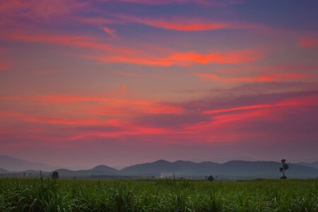 Colorful sky of sunset above green filed corn farm in front of mountain location at north of Thailand