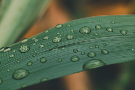 Water drops on fresh green leaf grass blur background